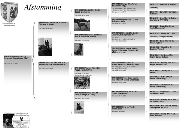 LAS POSIBLES MADRES, SON HIJAS DE BLITZ Y NUESTRA PASTORA HOLANDESA BETSIE, CUYA PROCEDENCIA , POR PARTE PATERNA,ES IDÉNTICA A LA DE SYB YA QUE ES HIJA DE BORIS II Y POR PARTE MATERNA ES HIJA DE KYRA, PERRA CON CERTIFICACIÓN POLICIAL KNPV, UNA DE MAS MEJORES HEMBRAS HIJAS DE TOMMY PEGGE (UNO DE LOS MEJORES REPRODUCTORES A NIVEL MUNDIAL DE LA ACTUALIDAD) Y SU MADRE (DE KYRA) ES BRENDA, OTRA DE LAS REPRODUCTORAS DE LA CASA DOEZÉ E HIJA DE BORIS POR LO QUE EN ESTE CRUCE HABRÁ UNA CONSANGUINIDAD 2-3,4 SOBRE BORIS Y 2-3 SOBRE DIEKE VAN DE MEIDER LO QUE AUGURA SIN DUDA UNA REPRODUCCIÓN DE GRAN DUREZA